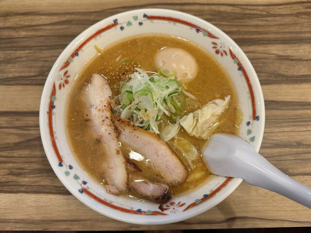 这次我选择了味噌煮蛋拉面作为稍晚的午餐。我很幸运地没有排队就进去了。这道菜的汤底带有姜的味道,比起Sumire先生的更清淡。叉烧肉里的油脂较多,这一点我很喜欢。葱、白菜和豆芽也都加在里面,令人高兴。蛋黄呈浅黄色,半熟的状态,非常美味。谢谢款待。