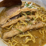 这家店的门帘上刻着“紫罗兰”和“幻之车站”的字样,被称为“纯紫系”五大门帘之一。我之前吃过彩未、大岛、郷、三ん寅,所以现在来这里就算是完全制霸了。“味噌叉烧面/1300日元”我一边等着一边交了票,坐在吧台上,马上就上菜了。相比于叉烧面来说,叉烧看起来并不突出。炒青菜堆得高,顶部撒了纯紫系的象征——磨成泥状的姜。可能那个更加显眼吧。汤是比较温和的类型,适应了几乎不用油脂膜的时代。我个人更喜欢浓郁的口味,所以觉得有点不够浓郁,但这可能是现在的主流吧。热腾腾的美味和味噌的浓郁仍然存在。面条不是西山的,而是森住制面。毕竟对于纯紫系来说,森住才是王道吧。最近西山也很有声势,所以我个人很高兴这个选择。面条的卷曲度适中,稍微粗一点的面条非常有存在感,份量也很足。不过周围的人大多都点了加大份。可惜的是,没有配菜的炒饭,更奇怪的是没有煮蛋。菜单上真的只有拉面,我也好奇盐味和酱油味是什么样的。随时可以来的人可以轻松尝试,真不错。