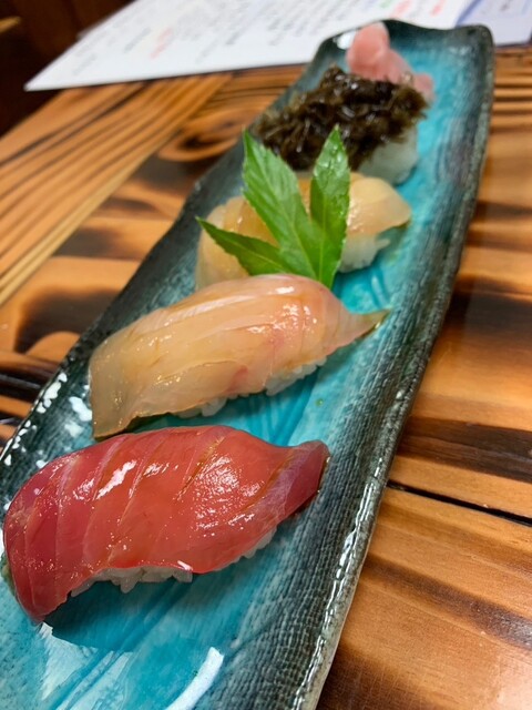 晚餐来这里。在紧急事态宣言期间,不能提供酒类,所以用明日葉无酒精啤酒干杯。明日葉有独特的浓郁口感,就像混合了青汁和啤酒一样容易入口。三种刺身拼盘包括金枪鱼、秋刀鱼和鲷鱼。这些闪闪发光的美味刺身非常厚实。明日葉和島オクラ的天妇罗拼盘。明日葉的天妇罗稍微有点苦,外皮酥脆,有些苦味。島オクラ又厚又嫩。島寿司需要提前预订,所以在预订时点了。我和伴侣分着吃了一份,所以照片是半份。包括金枪鱼、秋刀鱼、鲷鱼和紫菜四种。腌制的味道比较温和。紫菜是我最喜欢的。虽然这天也品尝了八丈岛的地方美食,但没有酒的话食欲和享受都减半。这家餐厅的菜肴很美味,但价格有点针对游客的高。