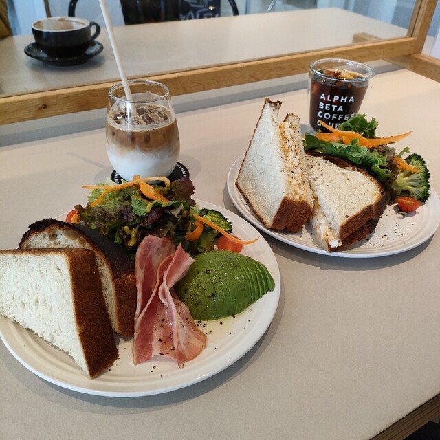 我在自由が丘駅正面駅入口附近步行1分钟的地方,名叫"ABC"的餐厅享用了早餐。尽管靠近车站,但这是一个时尚的地方,甚至有露天座位,我在Instagram上看到过,一直想来一次。餐厅内部也很明亮,中央的桌子上有插座,还提供Wi-Fi服务。到处都有人在电脑上工作,让我深刻地感受到未来在家办公将成为标配。我本来计划在露天座位上享受时尚的咖啡早餐,但阳光比我想象的要强烈,所以我只好撤退笑。我原本想点的鳄梨吐司不是早餐菜单上的,只能等到午餐时点,所以计划有所改变,但我成功地在早餐盘上加了鳄梨作为配料^^v我丈夫点了蛋三明治盘。看起来早餐的两个主要选择是这两个。虽然价格略高,为990日元,但经过烤制的面包非常美味,配上咖啡,在自由が丘駅前度过时尚的时光真是奢侈。下次我想尝试午餐,再次品尝鳄梨吐司♪